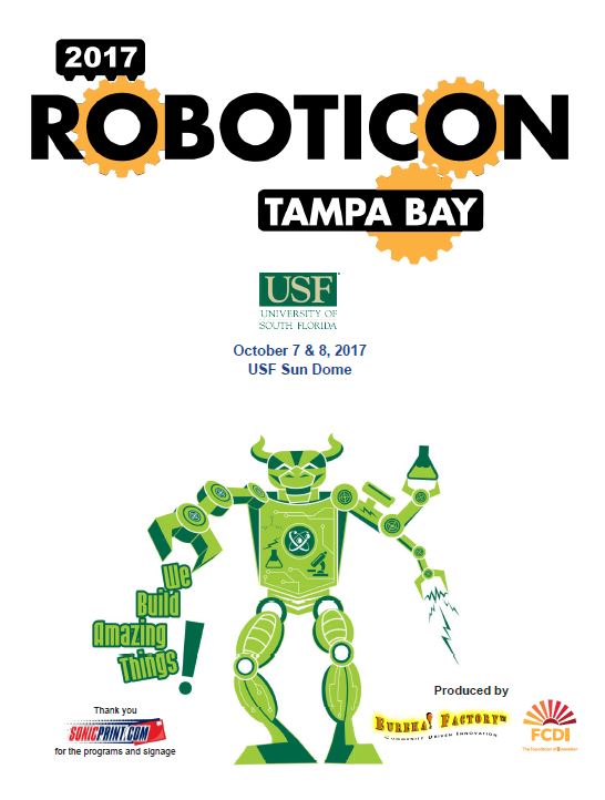 Our 2017 ROBOTICON Tampa Bay event program is now online . Check out our great line up of teams, the public agenda and our terrific sponsors! With immense gratitude to our graphic arts partner, Studio 7 Communications and to Sonic Print for their generous donation of printing services for the third year in a row. We couldn’t do any of this without you!